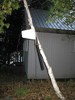 Carrie and I resorted to walking around camp with the router plugged into a Power Pack in a last ditch attempt to locate a signal. Failing yet again we were walking back across the yard with the antenna pointed toward the ground when Carrie realized we were finally getting a signal! She had left the computer open and the internet was working! Upon further inspection, we determined there was only a two foot window of signal. So this is what the new antenna mount looks like.