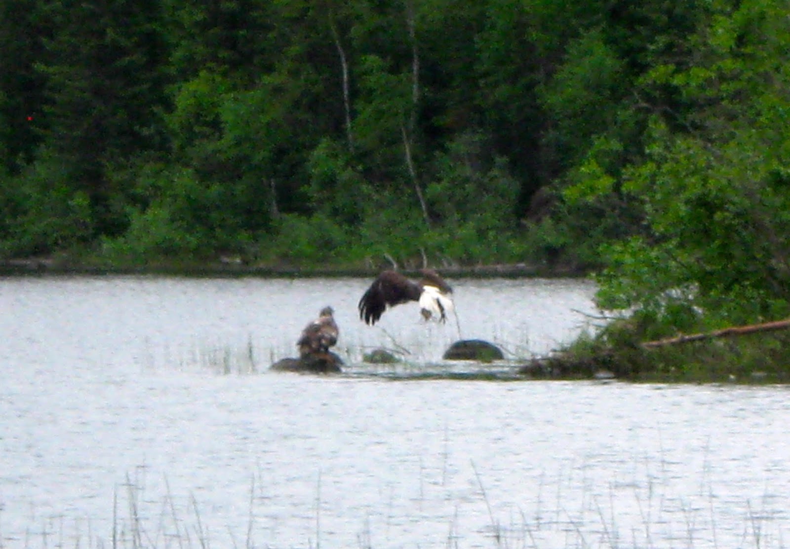 We like the eagles.  And its not just because we’d be feathered and tarred if we didn’t (is that too ironic, perhaps?) but we genuinely like them.  I think they are quite moving really.  Such a regal creature.  Its not too surprising that we see a fair amount out at the lodge – I mean its call EAGLE Falls Lodge!  Many eagles are viewed daily, from out in the boat and from on the deck back at camp.