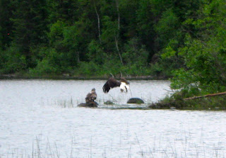 The first time we saw this eagle swim was incredible.  Its wing span seemed to double in size!  Here is the point in the story where I remind our readers that Cosmo likes to make the trip out to the point.  Cosmo also has great interest in any stick, rock, beaver, etc. that he sees in the water.  What was that you say?  Oh, no big deal.  Just Cosmo jumping out of the boat and swimming towards a BALD EAGLE!!!!