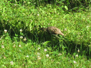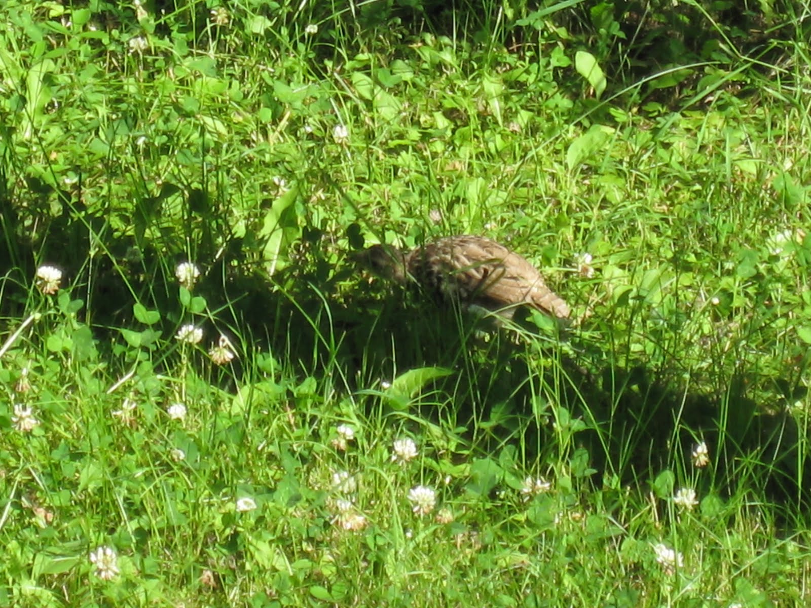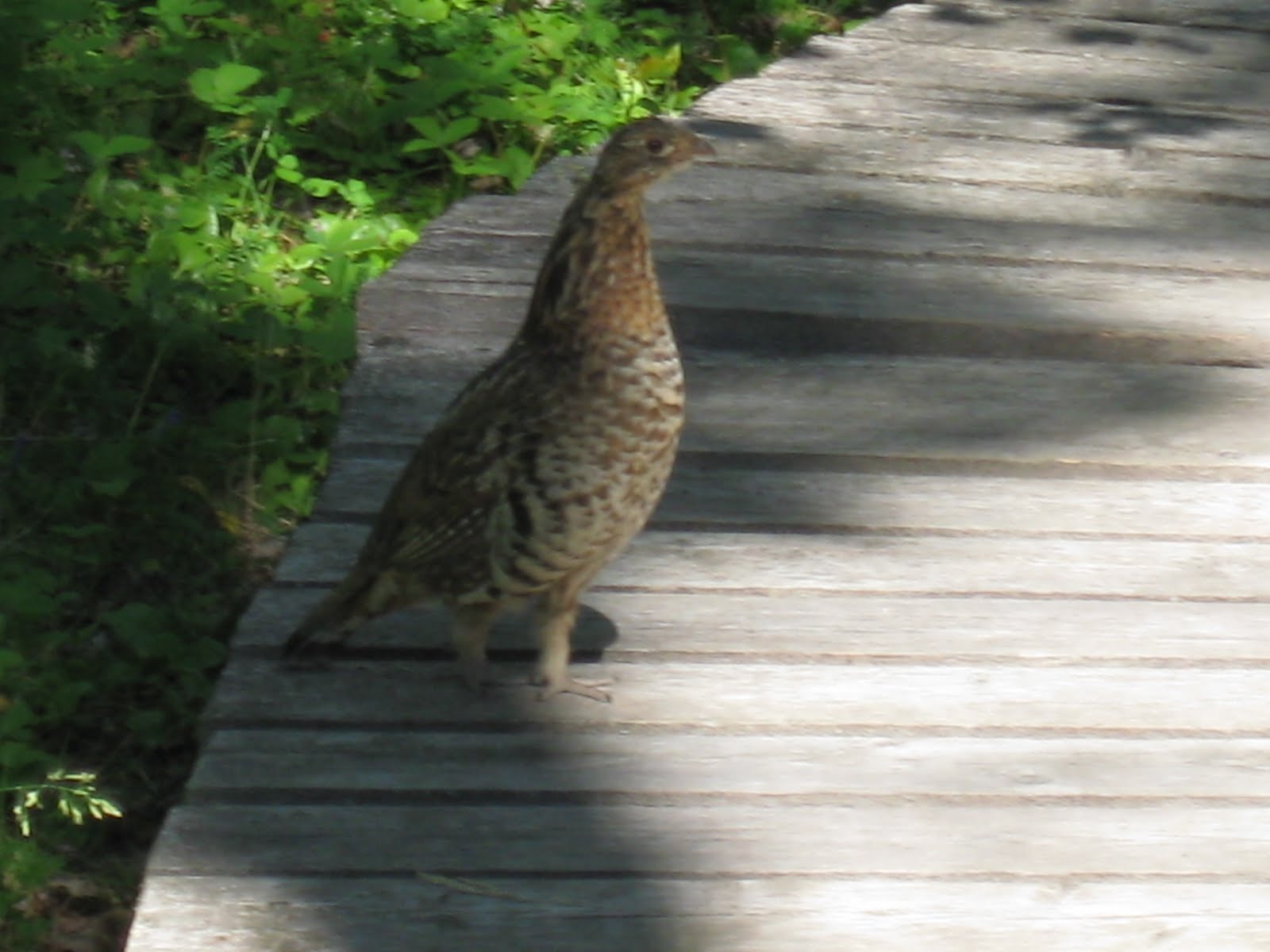 A ruffed grouse hen has been running around camp since we have arrived and now has a large following of chicks. She gets pretty defensive when Cosmo gets too close to investigate. Mother grouse pictured below.