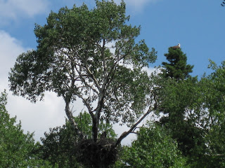 We have also enjoyed watching two baby eagles grow in the nest on Parker Lake. This is the 3rd season for the new nest and the 3rd season for two eaglets to hatch out. They are now learning to fly which is really fun to watch. The nest and young eagle can be seen in the lower part of the picture below and notice the mature eagle in the upper right.