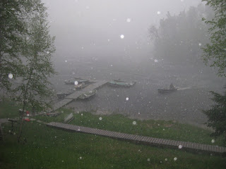 My brother Carson landed a 23″ walleye off a point near the lodge on Parker Lake shortly before the hail started. Visibility was poor, but he was able to make it back to the dock safely.