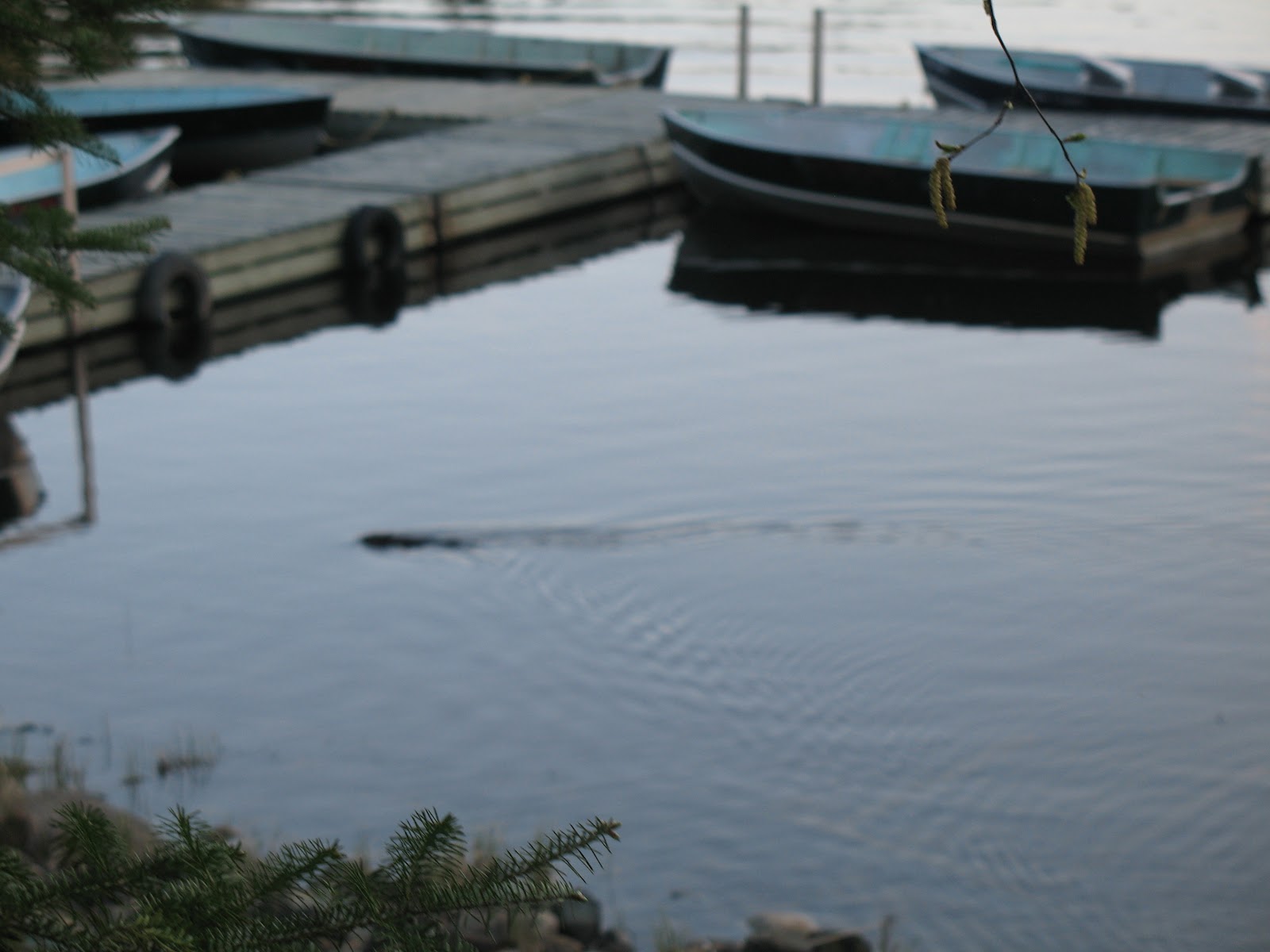 Beaver in the water + boats (without motors) in the background. We thought they might come ashore, but Carrie scared them off trying to get a photo.