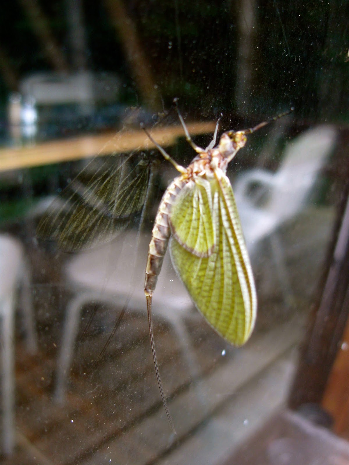 Mayflies are in the same insect grouping as dragonflies. An adult mayfly has a very short lifespan, ranging from a few hours to just over a day. They mate and eggs are laid on the surface of the lake where they sink to the bottom. Over the next several months immature mayflies molt 20-30 times. After developing wings they will molt one more time making them unique since they are the only insect species to do so.