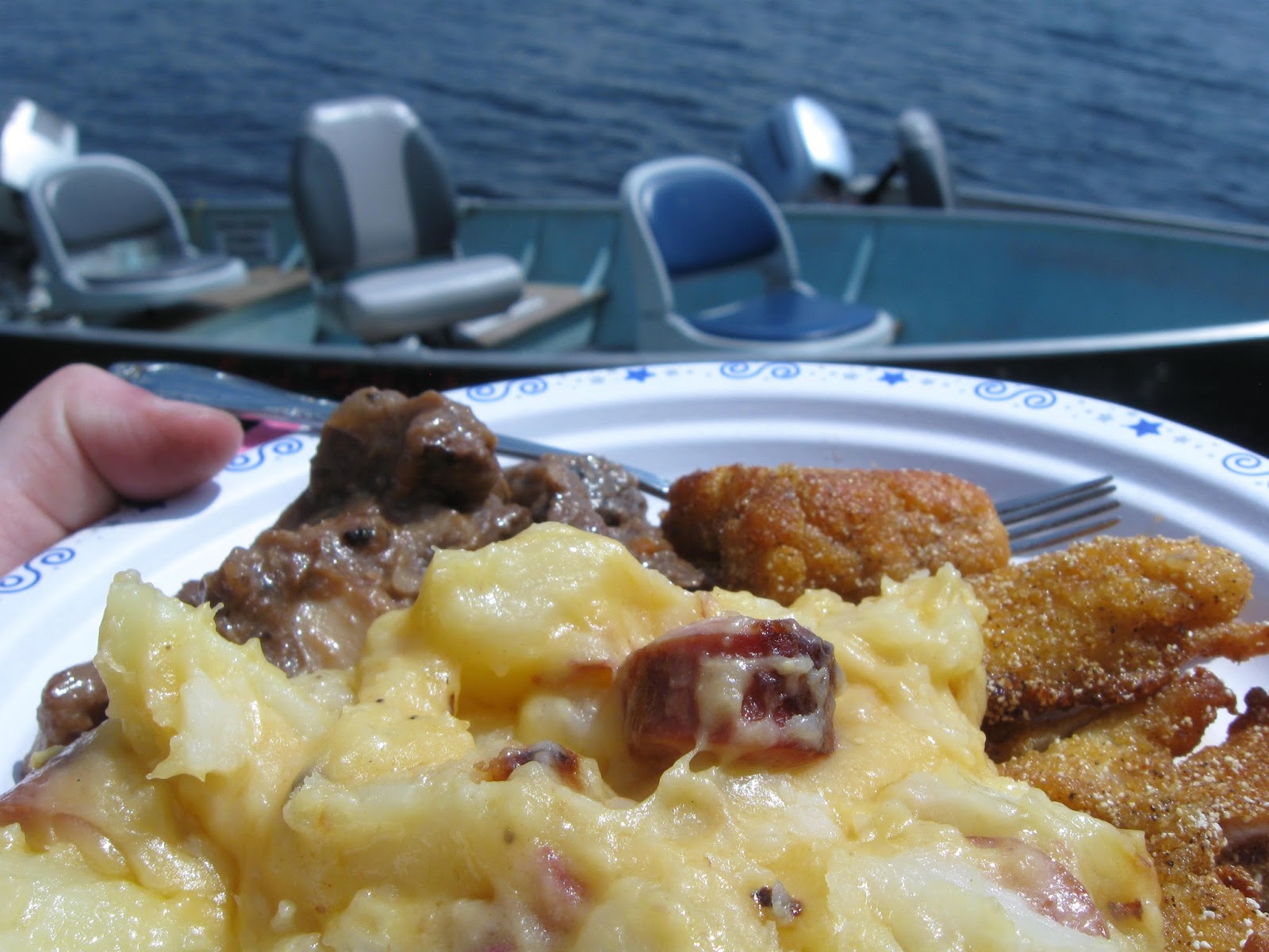 Jeff and Andy do all the traditional shore lunch dishes, but also make some delicious extra sides that make it memorable. These guys plan everything out and do all the cooking. We just show up and chow down! It was a beautiful day last week and one of the other groups at the lodge ended up joining in for MEGA SHORE LUNCH!