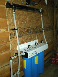 Today we had our shiny new water system installed by Red Lake Heating & Plumbing.  They were out here by 8:15 am with the trailer loaded full of gear to help us update our water treatment to the recommended methods outlined by Ontario’s Health Unit.  The Red Lake Heating & Plumbing guys are super nice; and Travis, of course, was giddy to watch and help them with the installation.