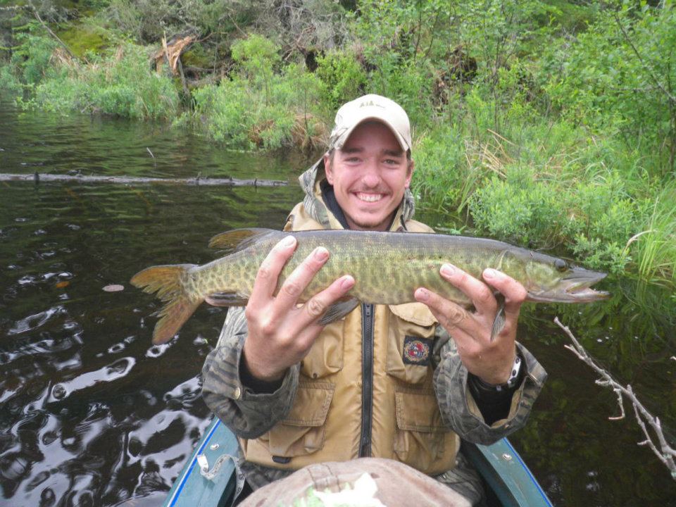 Need help identifying your catch? Most fish caught are Northern Pike. I know you didn’t forget what a Pike looked like, but here’s a refresher – Tom’s 43.5″ Northern off Red Lake. See the light spots on a dark background and rounded tail lobes.
