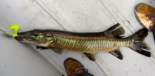Below is a barred Muskie that Carson caught last year. It is similar to the Tiger Muskie, but note the pointed tail lobes.