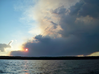 There are currently 93 forest fires burning in Northwest Ontario. See the thick smoke on the horizon above. We have been fortunate with wind direction lately to avoid heavy smoke like we had a week ago. Thick smoke and ash drastically reduced visibility for one day, but most of this week was much better. There was only one day since where you could actually smell smoke. Cooler weather and some light rain have improved the fire situation. The closest large fire is burning about 20 miles northwest of camp with plenty of water in between.