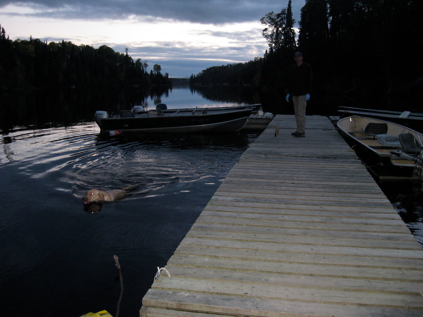 This memory came rushing back as Travis comes in the lodge to confirm my fears that Cosmo had indeed been skunked. So like most situations out at the lodge we do some quick creative problem solving to see what we can do with what is out at camp, because taking a boat ride into Red Lake after 5pm won’t do any good. I scan the dwindling pantry shelves (remember this is the last week, so things are clearing out) and spot a few cans of Campbell’s tomato soup. Not exactly tomato juice or anything that probably comes close to an actual tomato. In a perfect world we would log into google and search for skunk remedies, but alas we just have the insight of some guests, tomato soup, and one very stinky Cosmo. Travis corrals Cosmo to the dock on Parker and gets him in the water. He then lathers the tomato soup on the stinkiest areas, which proves difficult because Cosmo is now licking the tomato soup off his body faster than Travis can rub it on. Back in the water he goes. At this point neither of us are a good judge as to whether the smell is gone, or at minimum subdued. Cosmo has gotten very excited and licks any remaining soup bits off the dock before his long night holed up in the bathroom without his blankies.